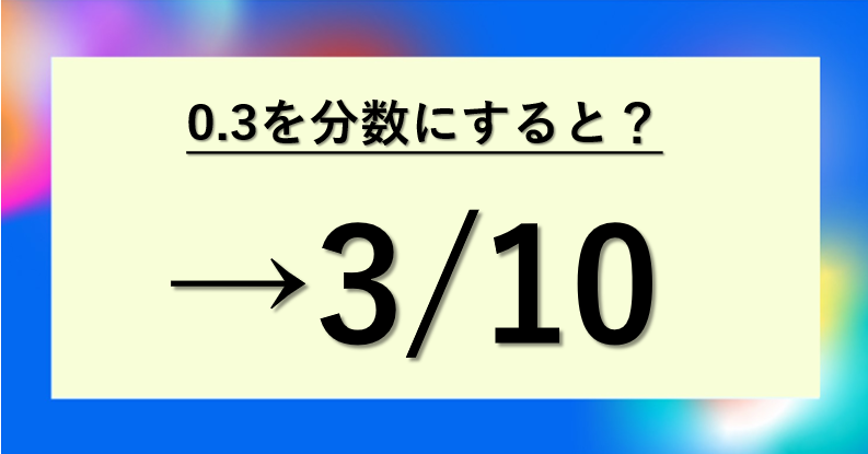 このステップを覚えておけば、0.3以外のさまざまな小数でも同じように分数へ変換することができます。まずは桁数を確認して分母を決めるという流れを身につけておくとよいでしょう。