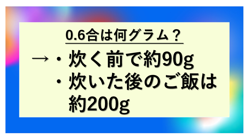 0.6合の米は炊く前で約90グラム・炊いた後のご飯は約200グラムが目安です!